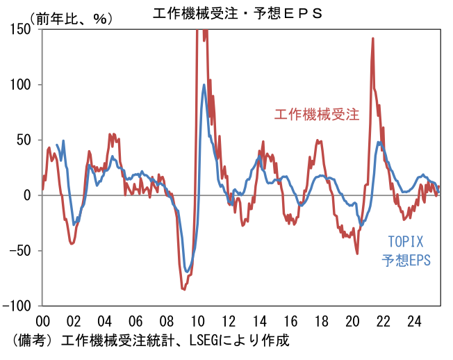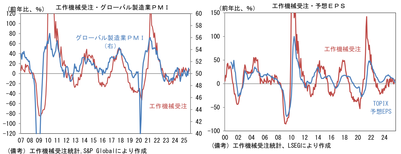 - 日本の工作機械受注は、そのサイクルがグローバル製造業PMIやアナリストの業績予想(TOPIX予想EPS)と連動性を有する。8月グローバル製造業PMIは50.9と好不況の分かれ目の目安とされる50を上回った。通商政策の不透明感が後退する中、新規受注が回復し、各国で景況感の改善がみられた。そうした下で、TOPIXの予想EPSは企業の資本効率改善に向けた取り組みが奏功したことも相まって増加基調を維持している。