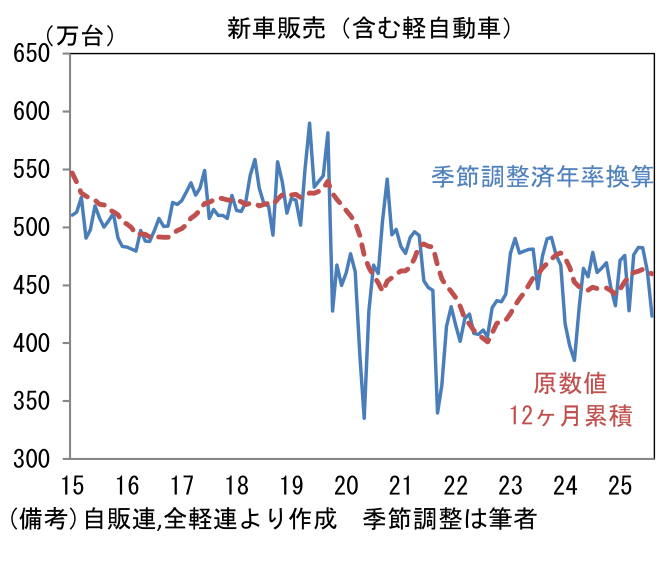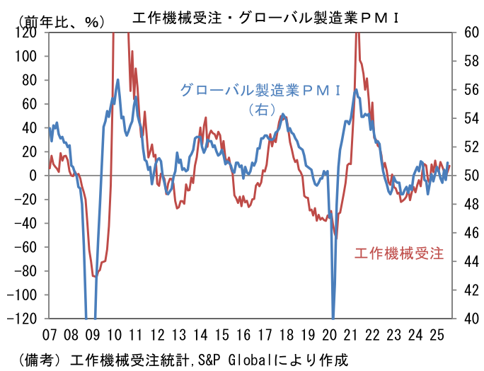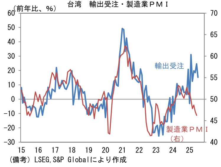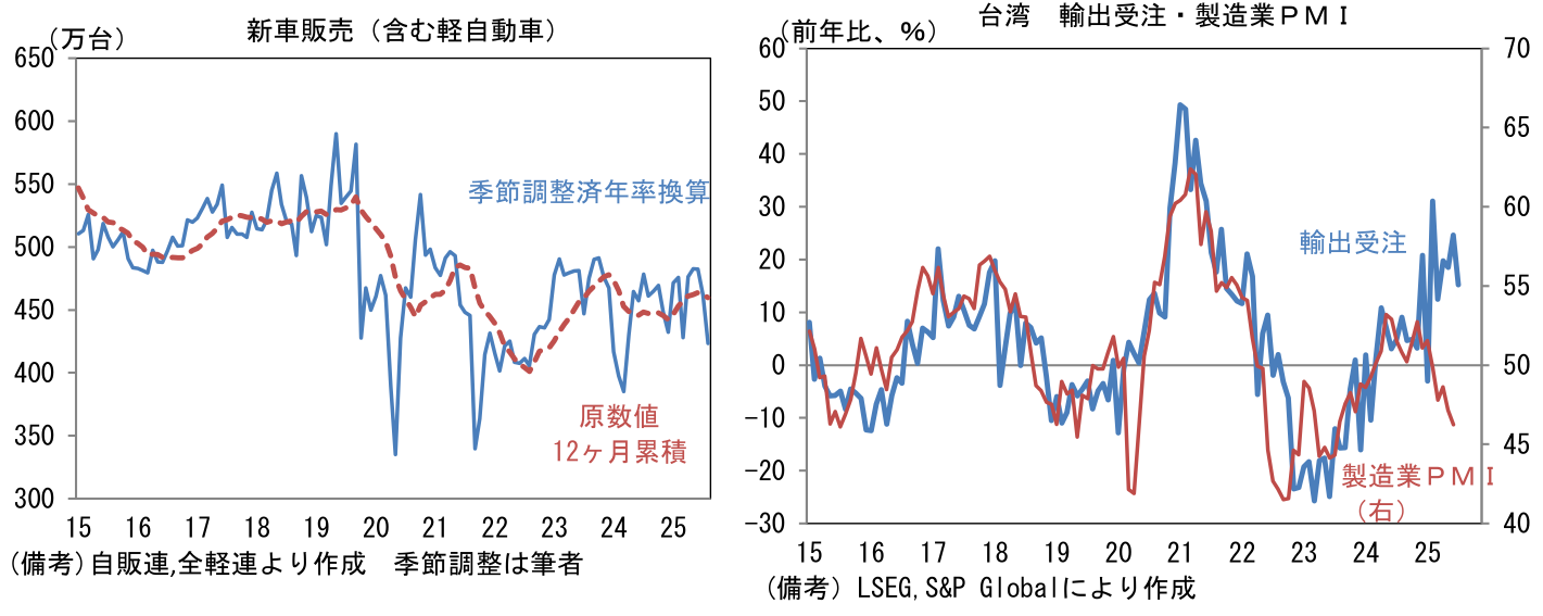 ・製造業PMIを地域別にみると、日本は49.7へと0.8pt上昇した。AI向け半導体以外の半導体需要が力強さを欠き、製造業全体として加速に乏しい展開が続いているが、トランプ関税による直接的な影響は限定的である。個人消費が緩慢ながらも回復傾向にあることを踏まえれば、大崩れは想定しにくくなってきた。事実、国内自動車販売は大きくみれば、持ち直し傾向にある。この間、IT関連財の生産集積地である台湾は47.4へと1.1pt上昇した。輸出受注や生産統計の方向感と相違がみられ解釈が難しい面はあるが、(PMIの調査項目である)新規輸出受注の落ち込みに鑑みると、半導体にかかるトランプ関税を見越した駆け込み需要の反動が始まっているのかもしれない。この間、韓国も48.3へと0.3pt上昇したものの、水準は低い。