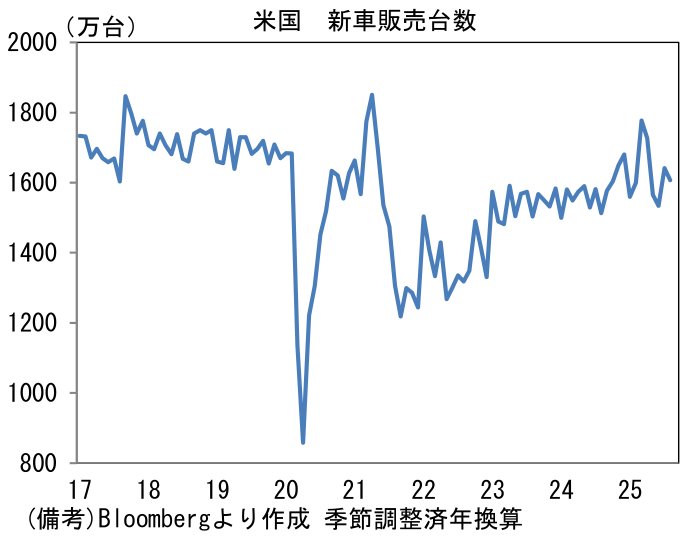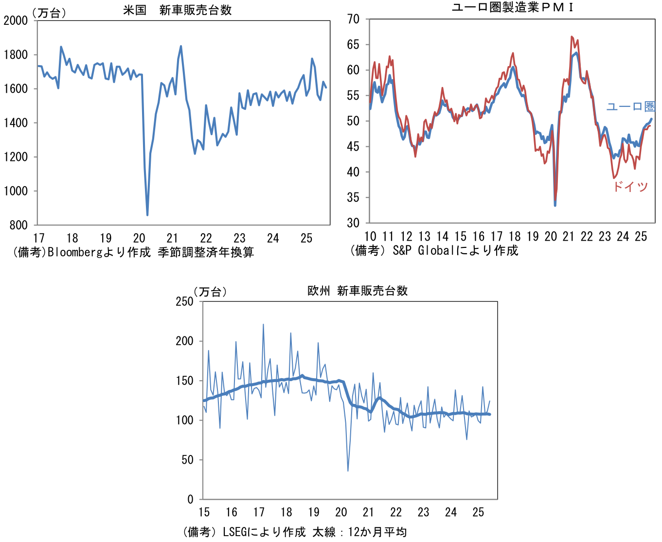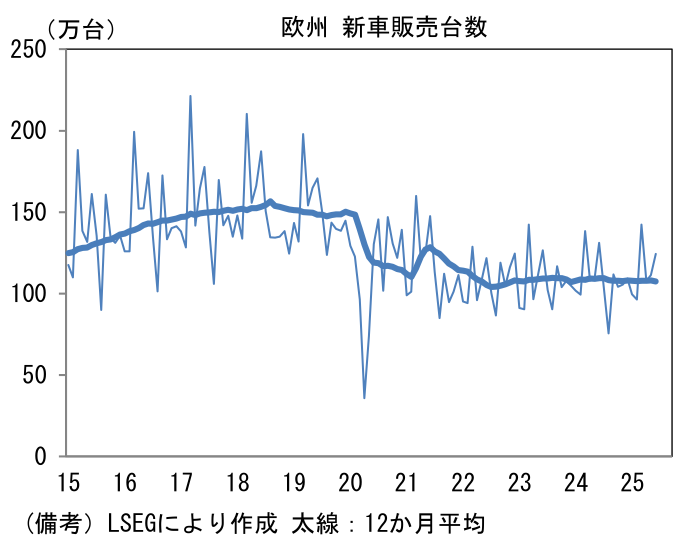 ・米国は53.0へと3.2ptもの上昇となった。類似指標のISM製造業(48.7)に比べて著しく強いため、割り引いてみる必要はあるが、自動車販売が底堅さを維持する下で、景況感は上向いている。ユーロ圏は50.4へと0.8pt上昇し、遂に50を突破した。財政拡張に舵を切ったドイツが49.8(7月49.1)と苦境から脱出しており、域内景気を押し上げている様子が窺える。対米輸出の落ち込みに対する警戒感もあって、各国政府が自国産業の梃入れに動いている様子が見て取れる。もっとも、現時点において欧州の新車販売台数はコロナ期に生じた断層が埋まる気配は感じられない。
