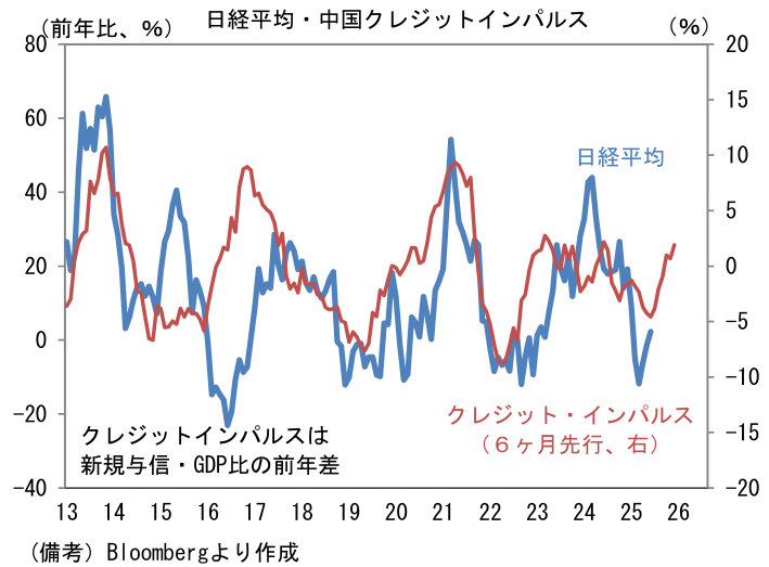 ・中国は50.5へと1.0pt上昇。既往の不動産市況悪化とトランプ関税対策として、中国当局が景気対策に本腰を入れ始めたことが下支えとなっている模様。マネー関連統計に目を向けると、7月の社会融資総量(新規フローの12ヶ月平均値)は前月比+1.0%と8ヶ月連続で増加し、社会融資総量残高も前年比+9.0%と底打ちが明確化している。新規融資のGDP比(前年差)をとった、通称クレジットインパルスをみても+1.9ptとプラスに転化しており、政策態度の変化がマネー統計に表面化してきた可能性が窺える。この指標が日本株の先行指標として機能してきた経緯を踏まえると、現在の株高は一定の裏付けを伴っていると言える。
