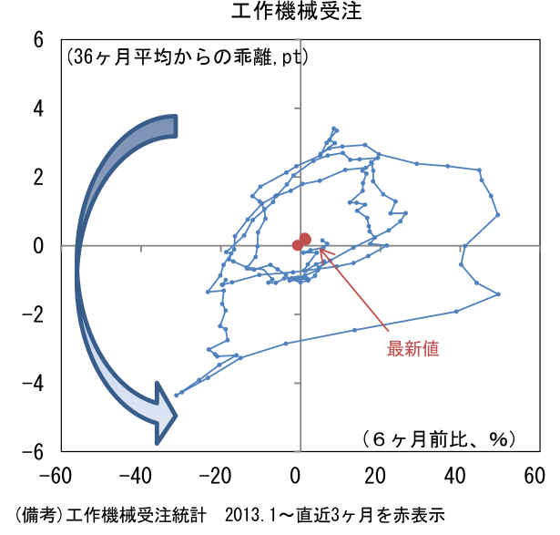 - 工作機械受注サイクルの位置取りを確認するために、縦軸に受注額の水準(36ヶ月平均値からの乖離)、横軸に方向感(6ヶ月前比)をとった循環図をみると、直近数ヶ月は中心点付近で小さな渦を描いている。過去の経験則に従うなら今後は右方向へ進んだ後、上向き方向に進路をとると予想され、回復傾向がはっきりとしてくるだろう。
