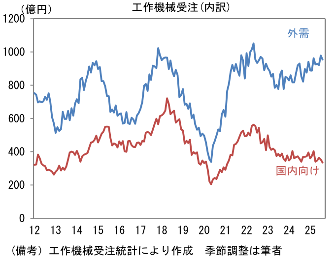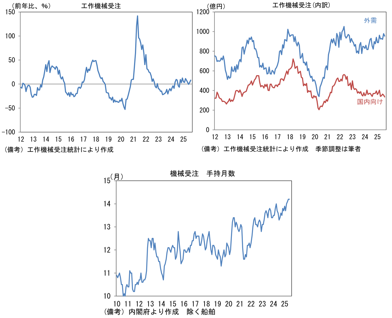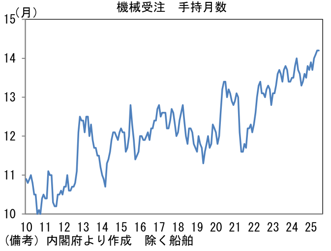 9月9日に発表された8月の受注額(原数値)は1197億円、前年比伸び率は+8.1%であった。筆者作成の季節調整値は前月比▲3.1%と減少したが、3ヶ月平均値では+0.1%と辛うじてプラス基調を維持。単月の内訳は「国内向け」の季節調整済み前月比が▲5.2%と2ヶ月連続で減少し、3ヶ月平均でも同▲1.2%と弱さが続き、前年比も▲1.4%とマイナス圏に沈んだ。設備投資意欲はそれなりに強いものの、人手不足が足かせとなり、設備投資の進捗が遅々としているのかもしれない。関連投資の機械受注に目を向けると、受注残高および手持ち月数が積み上がっており、新規の受注が抑制されている可能性が示唆されている。他方、「外需」は前月比▲2.4%と反動がみられたものの、3ヶ月平均では+0.9%と増加を続け、前年比では+12.0%と10ヶ月連続でプラスを維持した。地域別詳細は確報を待つ必要があるが、7月までの傾向から判断すると欧州向けが回復する中、米国と中国、韓国・台湾が増加基調を維持したとみられる。