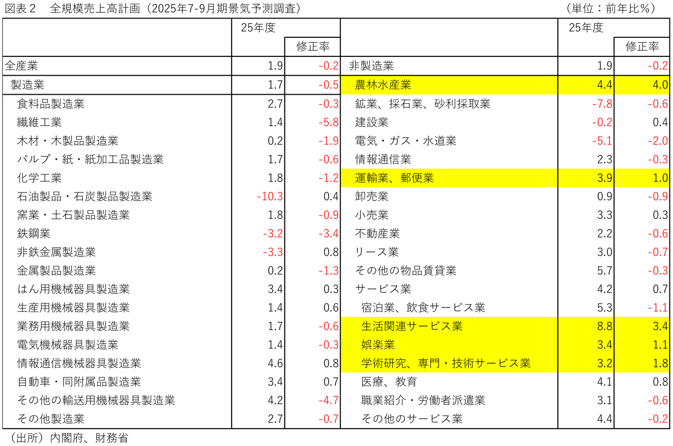 9月11日に公表された2025年7-9月期の法人企業景気予測調査は、今年8月下旬にかけて資本金1千万円以上の法人企業に対して行った景気予測調査であり、今期の業種別企業業績計画を予想するための先行指標として注目される。