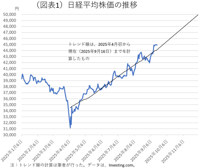 まず、足下の株価上昇について振り返ってみよう。株価上昇の起点は、2025年4月のトランプ関税ショックになっている(図表1)。そこから上昇トレンドが始まり、45,000円への到達に至った。さらに、4~9月にかけてのトレンド線を延長すると、2025年末には株価5万円の到達を予想させる。さすがにそこまで持続性はないだろう。ただ今は、そのくらい異例の株価上昇が起こっているのだ。