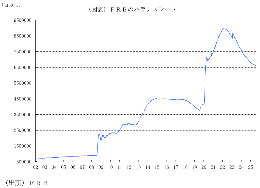 バランスシートの縮小策では、25年4月1日から保有証券の圧縮を月間上限額300億ドル(600億ドル)に半減されたが、このペースを維持することが決定された。内訳は、米国債の上限額を50億ドル(250億ドル)に減額する一方、エージェンシー債、政府支援機関保証付き住宅ローン担保証券の上限額は350億ドルに維持したうえ、これを上回る額を国債に再投資する。
