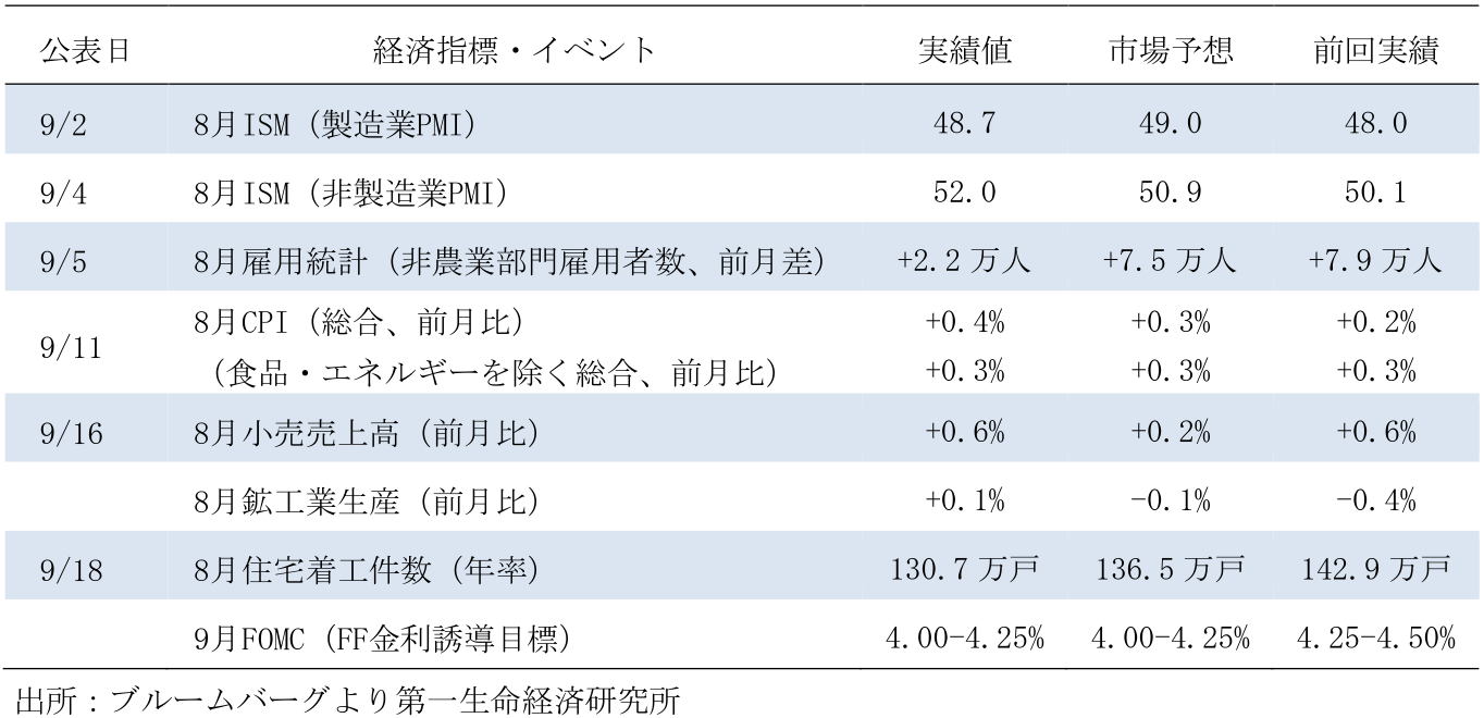 8月ISM製造業PMIは48.7(7月:48.0)と2か月振りに上昇したものの、6か月連続で好不況の節目となる50を下回った。企業コメントでは「引き続き関税が計画やスケジュールの策定に混乱をもたらしている。(対インドへの50%関税など)予期せぬ関税が発表されるたびに、新製品の開発コストが上昇し続けている(コンピュータ・電子製品)」、「多くの部品に対する関税により、メイド・イン・USAの維持は益々困難になっている(電気機器・部品)」などと引き続き関税への懸念が目立つ。内訳をみると、雇用は43.8(43.4)、在庫は49.4(48.9)、生産活動に先行する新規受注が51.4(47.1)とそれぞれ上昇した一方、生産は47.8(51.4)と大幅に低下した。