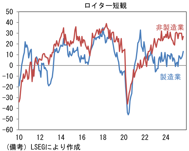 筆者は10月会合における利上げ予想を現時点で維持している。通商政策の不透明感が後退する中、国内では人手不足由来の賃金上昇も続いており、緩和的な政策態度を中立的に戻す必要があるとみている。10月入り後、日銀短観の結果や日銀支店長会議の報告が堅調であれば、利上げの道が拓けるだろう。なお、日銀短観の前哨戦としてロイター短観に目を向けると、9月単月では製造業に明るさがみえた。DIは+13と4-6月期平均の+7.7からはっきりと持ち直している。非製造業は+27と、4-6月期平均の+30の高水準から小幅に低下したものの、堅調そのものである。