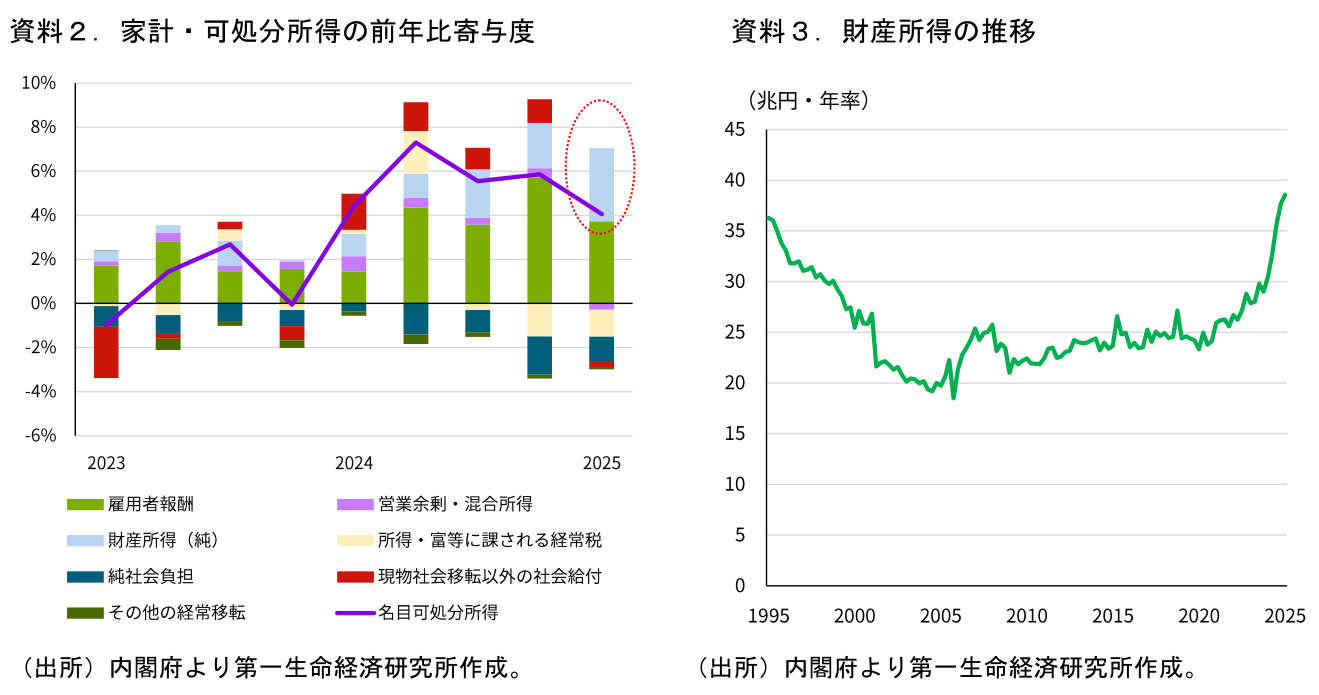 1 SNAの家計可処分所得は年次推計値が公表されるまでは参考系列とされており、一部は過去トレンド等で推計されている。政府資料によれば利子受取は直近データを用いた推計となっている一方、利子支払(変動金利の住宅ローン支払いなど)や配当はトレンド等で推計されている。年次推計(2024年度分は2025年末に公表)での改定余地が大きい点には留意。