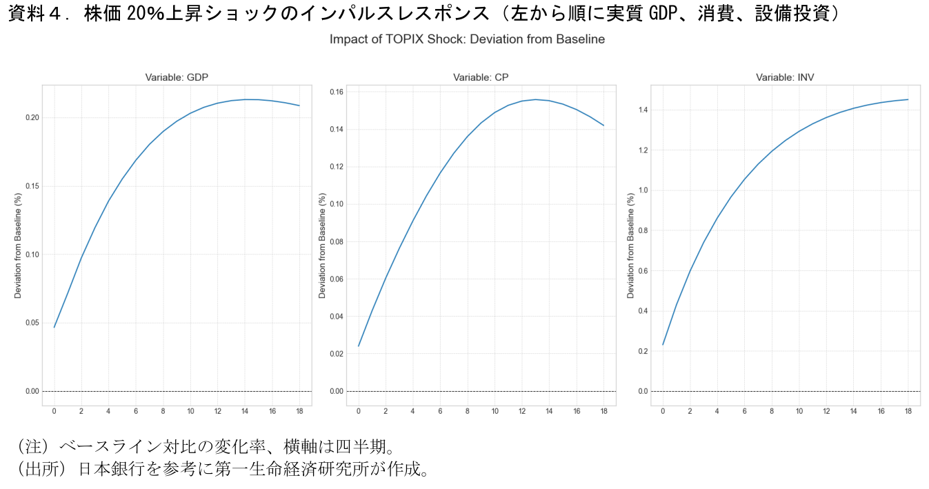 足もとでも株価上昇が進んでおり、日経平均やS&P500は過去最高値を更新している。マクロモデル(日銀Q-JEMを一部改訂)を用いて、株価(TOPIX)の20%上昇ショックの影響を計測すると、実質GDPをベースライン対比で1年目に+0.05%(0.3兆円)、2年目に+0.15%(0.9兆円)押し上げる計算となった(資料4)。モデルの係数は過去データから推定されたものであり、足元では新NISAによる家計のリスク性資産保有の拡大に伴って、潜在的に資産効果は高まっている可能性もあろう。