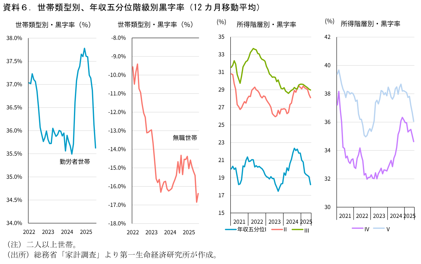 足元では、SNAの家計貯蓄に近い概念の日本銀行の資金循環統計における家計の資金過不足は直近4-6月期までプラス幅を縮小させている(資料5)。ミクロの貯蓄率(家計調査の黒字率)も確認しておくと、2025年ごろから勤労者世帯・無職世帯ともに黒字率が低下している。ミクロの貯蓄率は2024年には高まっていた。ここにはインフレによる消費者マインドの悪化のほか新NISA開始があると考えられる。消費から投資へ:今の消費を控えてNISAに回す動き、が貯蓄率の上昇として表れたということだ。足元では貯蓄率が低下傾向、消費性向が高まる傾向にある。