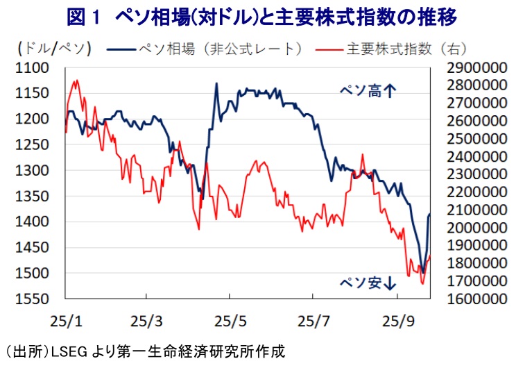 アルゼンチン金融市場では、今月7日に実施された首都ブエノスアイレスに隣接するブエノスアイレス州議会選挙においてミレイ政権を支える与党「自由の前進」が惨敗を喫したことをきっかけに、混乱の動きが広がった(注1)。同国では10月26日に連邦議会の代議院(下院)の半数、元老院(上院)の3分の1が改選される中間選挙が予定されている。自由の前進は連邦議会上下院双方で少数派に留まるが、ミレイ政権は連立政党や中間派政党の協力を得る形で、いわゆる『破綻国家』の立て直しに向けて構造改革を進めてきた。しかし、中間選挙の前哨戦とみられた同選挙では、最大野党「正義党(ペロン党)」を中心とする野党連合(祖国連合)が事前の世論調査を上回る形で勝利を収めた。よって、中間選挙では与党連立や中間派政党にとって厳しい結果になるとともに、その後はミレイ政権が進める改革路線に『黄信号』が灯るとの懸念が広がったことが市場の混乱に繋がった。その結果、通貨ペソの対ドル相場や主要株式指数(メルバル指数)はともに調整の動きを強めるなど、資金流出圧力が強まる事態に直面した。