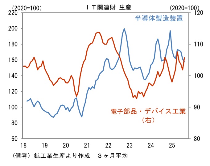 - 自動車と並ぶ重要産業である半導体関連については、電子部品・デバイス工業が前月比+0.4%と3ヶ月連続の増産となった。5月の大幅減産(同▲14.8%)が響き一時的に基調は下向きになったが、2023年前半を大底とする回復局面は続いている。過去数ヶ月、大幅な変動を主導した集積回路(IC)は5月に同▲30.4%となった後に反発を続け8月も同+2.4%と落ち込みを埋めつつある。なお、2024年12月に稼働したと伝わっているTSMC熊本工場の生産分が、鉱工業生産統計に反映されているのか否かを含め経済産業省からの情報発信はない。他方、生産用機械に分類される半導体製造装置は同+5.6%の増産であったものの、ピーク水準からは遠ざかっている。関連指標の機械受注統計(機種別集計)における電子計算機等の受注額もやや下向き基調になっている。