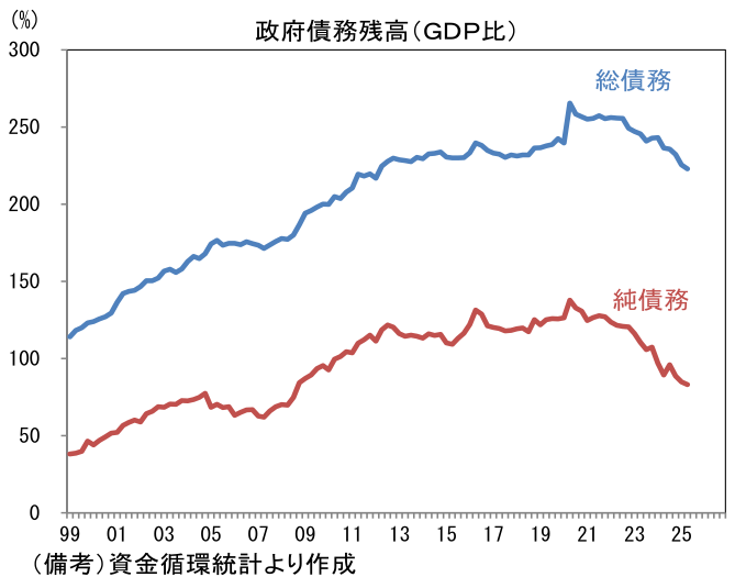 それでも高市総裁の財政拡張路線は強いだろう。財政政策のあり方について「財政健全化が必要ないと言ったことはない」として「純政府債務残高のGDP比を引き下げていく」という方針を示した。その裏には「財政は健全化している、それだけ支出拡大の余力がある」という含意があるとみられる。ここで資金循環統計から算出した政府債務残高のGDP比を確認すると、一般的によく用いられる総債務残高GDP比が222.8%であるのに対して、純債務残高GDP比に目を向けると83.0%と随分印象が異なる。どちらも2020年4-6月期を明確に下回り低下を続けているが、純債務は中央政府、社会保障基金(≒GPIF)が保有する金融資産の増加が効いているため、GDP比でみた低下幅がより大きい。コロナ期の直前にあたる2019年末との比較で、中央政府の資産増加に寄与したのは外為特会が保有する「対外証券投資」、「その他対外債権債務」であり、それぞれ23.9兆円、10.4兆円の増加となっている。社会保障基金ではGPIFの含み益が効き、「対外証券投資」が70.8兆円、株式等が28.5兆円の増加となっている。何れも円安・株高が背景にあるとみられる。