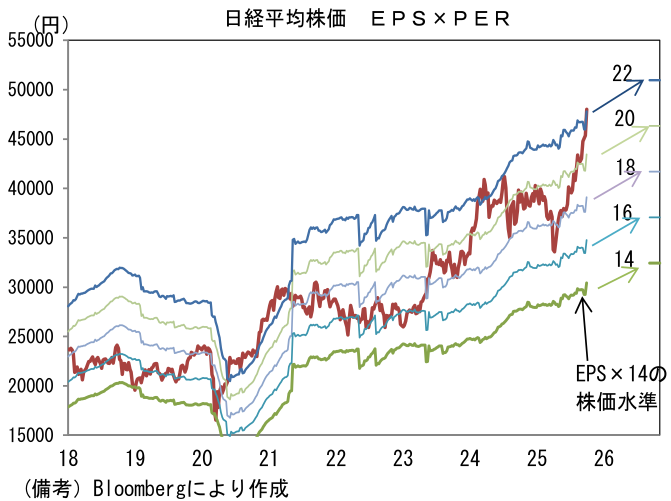 最後に株価については総裁選後に約4.8万円まで上昇しており、さすがに過熱感が目立つようになってきた。指数ベースの日経平均PERは22倍を超えており、過去数年の上限付近に到達している。一段の上昇は「所得税の基礎控除の大幅引き上げ」など目玉の減税策が現実味を帯びる必要があるだろう。