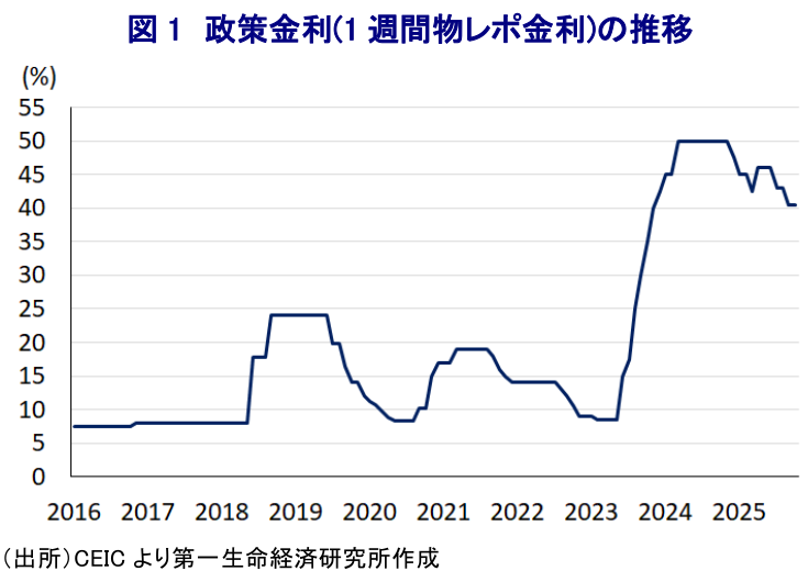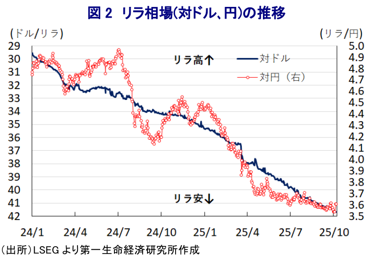 - 一方、トランプ米政権の政策運営の不確実さやドル安基調のなかでもリラ相場は下落が続いている。背景には、エルドアン大統領による金融政策への介入懸念や政治リスクの高まりが影響している。さらに、米国はロシア産原油の輸入国への追加関税を課す方針を示すなど、外交的な圧力もリラ安を招いている。