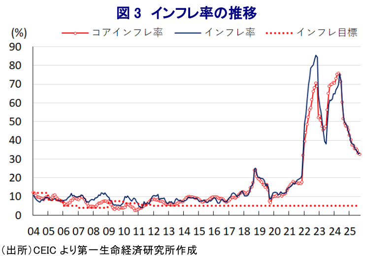 こうしたなか、直近9月のインフレ率は前年同月比+33.3%と前月(同+33.0%)からわずかながら伸びが加速した。食料品など生活必需品のみならず、リラ安の進行による輸入物価の上昇も重なり幅広く物価に上昇圧力が掛かる動きが確認されるなど、昨年5月をピークに鈍化基調が続いてきた流れに変化の兆しが出ている。仮に足元のペースで物価上昇圧力がくすぶる展開が続けば、年末にかけてインフレは加速の動きを強めると見込まれ、鈍化傾向が続くとの見通しを示している中銀の見方と乖離が生じることになる。なお、足元のインフレ率は加速に転じているものの、食料品やエネルギーに加え、金を除いたコアインフレ率の伸びは鈍化基調が続いており、金融市場においては中銀が一段の利下げに動くとの見方は根強く残る。しかし、中銀がそうした判断を下せば先行きのリラ相場は底なしの状況に陥ることも予想されるため、中銀はこれまで以上に難しい政策判断を迫られることになろう。
