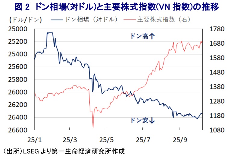 しかし、今回の格上げによって、これまでパッシブ投資家による資金流入が期待できない「フロンティア市場」から、資金流入が期待される「新興国市場」となる。よって、今後は海外から一定程度の資金流入が起こるとともに、IPO(新規株式公開)市場が活発化するなど株式市場のすそ野の拡大や厚みが増していくことが期待される。年明け以降のベトナム金融市場においては、景気の堅調さを追い風に主要株式指数(VN指数)は上昇の動きを強めてきたほか、今回の格上げ決定を受けて最高値を更新するなど活況を呈している。その一方、トランプ米政権の政策運営の不確実性に加え、FRB(米連邦準備制度理事会)による利下げ実施も追い風に米ドル安が意識されやすい状況が続いている。こうした状況もかかわらず、ドンの対ドル相場は調整が続くなど対照的な動きをみせている。今回の格上げに伴う海外からの資金流入の期待は市場を取り巻く環境を変化させる可能性はあるものの、今後はトランプ関税による影響の顕在化が見込まれるなか、市場環境が大きく変動することに留意する必要がある。