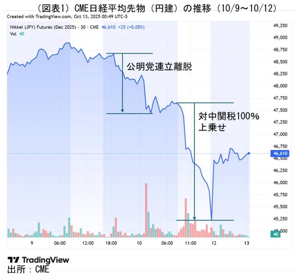 10月10日の東京株式市場の取引終了後に発表された公明党の連立政権離脱と、同日米国で発表された中国への関税率の100%上乗せの報道で、市場環境は一変した。