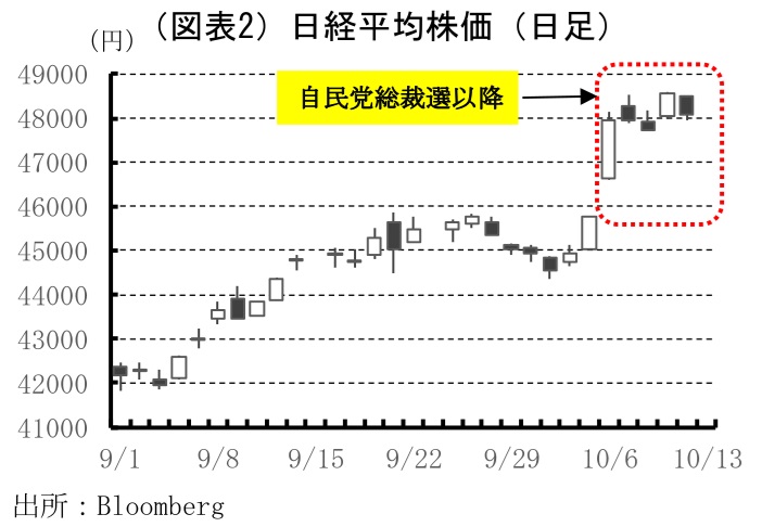 10月4日に投開票が行われた自民党総裁選で高市新総裁が誕生して以降、日本の株式市場は積極的な経済対策期待から大幅に値を上げ“高市トレード”とも呼ばれた。日経平均株価は自民党総裁選前の45,769.50円(10月3日終値)から、9日には48,580.44円まで+2,810.94円(+6.1%)上昇した(図表2)。