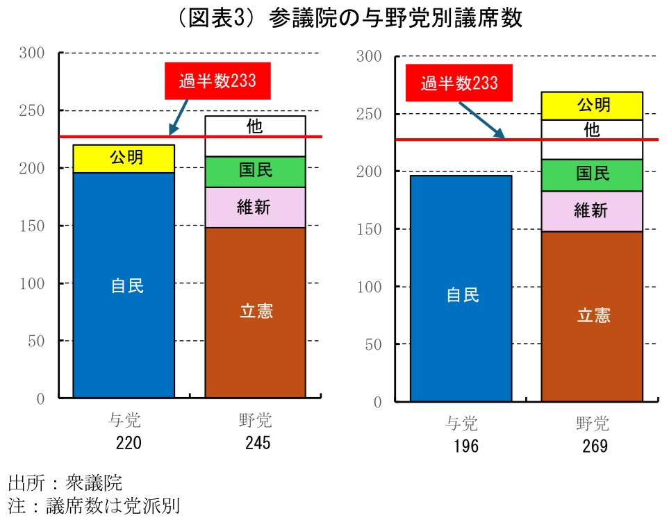 現在の主要野党間が主張する政策の“距離感”を勘案すれば、野党で過半数を得られる統一候補に投票する可能性は高くはないと考えられる。その場合は自民党総裁が新首相に選出されることになるが、与党の議席数は公明党の離脱によってさらに少なくなるため、政府はこれまで以上に国会運営に当たっては野党の協力を仰がざるを得なくなり、“サナエノミクス”のような独自色の強い政策を優先的に打ち出すことは難しくなるだろう。