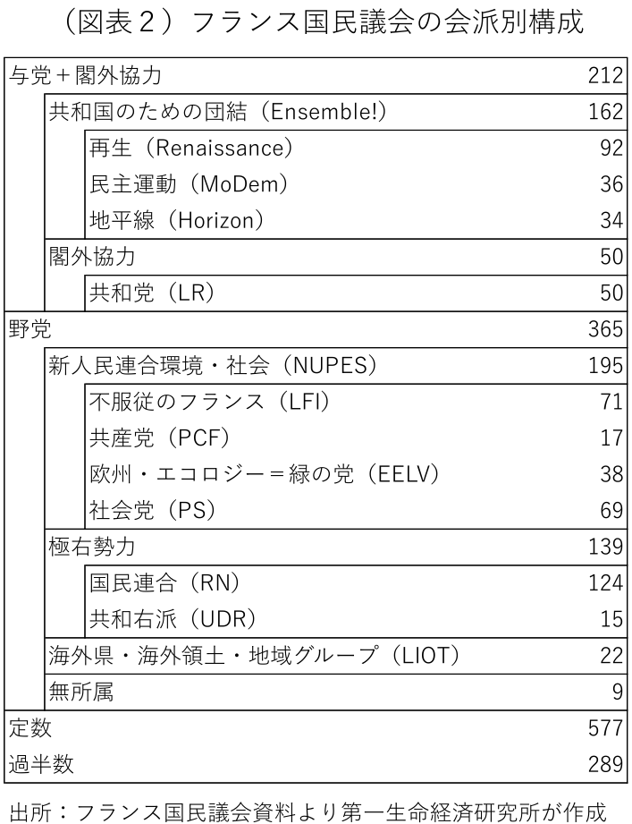 マクロン大統領から予算成立に向けた政権基盤の強化と野党の協力取り付けを託されたルコルニュ首相は6日、就任から僅か26日で辞任の意向を固めた。ルコルニュ首相は、穏健な左派政党・社会党(PS)の協力取り付けに向けて同党関係者の説得を続けていた。首相の社会党への接近に対して、これまで政権に協力してきた右派政党・共和党(LR)は、5日に発表した第一次ルコルニュ政権の閣僚の布陣がマクロン大統領を支持する中道勢力・共和国のための団結(ENS)に偏り、要求した閣僚ポストを配分されなかったことに不満を募らせ、政権協力を取り止める意向を示唆した(図表1)。現在の議会構成を考えると、仮にルコルニュ首相が社会党の協力を取り付けることに成功しても、共和党の協力なしには安定した政権運営を行うことは難しい(図表2・3)。