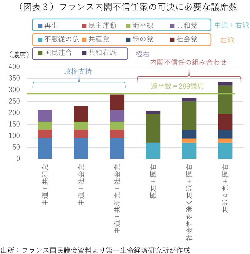 その間、大統領を支持する中道勢力の一員として、これまで政権運営を支えてきた中道政党の民主運動(MoDem)や中道右派政党の水平(Horizon)などは、このまま政権に参加し続けるか、閣外から政権を支えるか、14日のルコルニュ首相の所信表明演説を待って判断するとしていた。ルコルニュ首相は再任後の新たな閣僚人事でこれらの政党の議員を指名することで、政権から離反することを食い止めた(前掲図表1)。また、同様に閣外協力の方針を示唆していた共和党の6議員も閣僚に指名したが、閣僚参加を否定する党の方針に逆らったとし、共和党幹部はこれらの議員を除名する意向を示唆している。