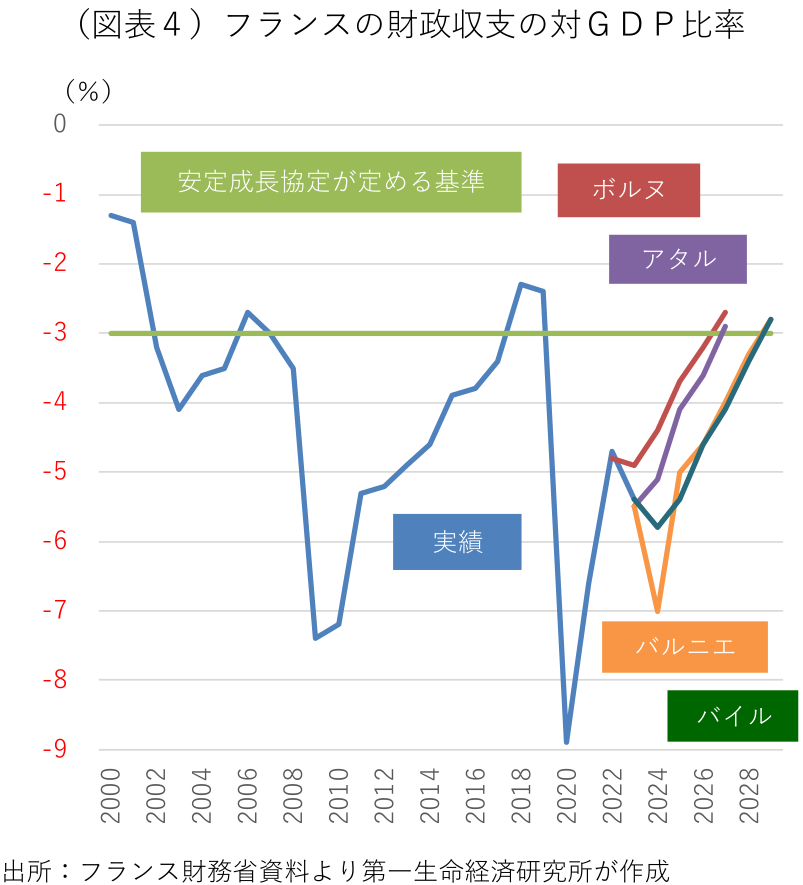 これを受け、ルコルニュ首相の再辞任による政局の更なる混乱や、極右勢力の伸長が予想される国民議会選挙の前倒しはひとまず回避されよう。ただ、憲法49条3項を利用せずに予算案を議会で通すには、社会党から予算案の細部で改めて賛成を取り付けなければならない。社会党は年金支給開始年齢の引き上げ凍結を歓迎しているが、ルコルニュ首相の緊縮的な予算案に反発しており、今後の予算協議がすんなり進む可能性は低い。社会党から更なる譲歩を求められ、財政再建が計画対比で遅れる恐れがある。また、今のところ閣外から政権への協力を継続する姿勢をみせている共和党は、「ルコルニュ政権が社会党の人質になった」として今回の方針転換を非難している。共和党からの離党者が結党し、国民連合と連携する極右政党・共和右派(UDR)のシオッティ党首は、共和党のルタイヨ党首に対して、政権への協力取り止めと極右勢力との連携を呼び掛けている。右派と極右が総結集した場合、次の議会選挙後の政権奪取に近づく。まずは、今後本格化する予算協議で社会党の賛同が得られるかと、右派と極右の接近の有無に注目が集まる。年末までに2026年予算の成立に漕ぎ着けた場合、来年3月には地方選挙、再来年4・5月頃には大統領選挙が近づいてくることもあり、前倒しの議会選挙の可能性が遠退く。