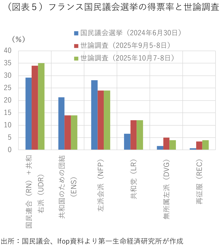 こうしたなかで迎えた14日のルコルニュ首相の所信表明演説と、社会保障部分の来年度予算案の発表では、今後の法案審議で憲法49条3項を利用しないこと、社会党案とは別の富裕層課税を導入すること、年金支給開始年齢(62歳から64歳に段階的に引き上げる予定で、現在は62歳9ヶ月)の引き上げを凍結することを盛り込んだ。但し、年金改革の一時停止に伴い、2026年に4億ユーロ、2027年に18億ユーロ程度、財政収支が悪化するとして、別の歳入増加策(増税や脱税の取り締まり強化など)や歳出削減措置(医療保険、退職年金、家族手当などの抑制)でその穴埋めが必要になることを表明した。2025年の財政赤字の対GDP比率の目標値を前政権が掲げた5.4%に据え置き、2026年を5%未満(前政権は4.6%)に削減する計画で、財政再建路線を継続する(図表4)。左派勢力や労働組合の間では、年金改革の完全撤回を求める声もあるが、支給開始年齢の引き上げ凍結を「第一段階の成果」として概ね歓迎している。各種の世論調査で極右政党・国民連合(RN)が一段と支持を伸ばしており(図表5)、早期の解散・総選挙を回避したいことも、社会党の方針転換を促した。最終的には、年金支給開始年齢の引き上げ凍結が決定打となり、社会党は別の野党が提案する内閣不信任案に同調しない方針を固め、ルコルニュ首相が続投する可能性が高まった。