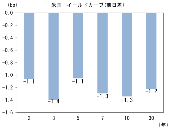 米金利はカーブ全般で金利低下。予想インフレ率(10年BEI)は2.289%(+1.4bp)へと上昇。