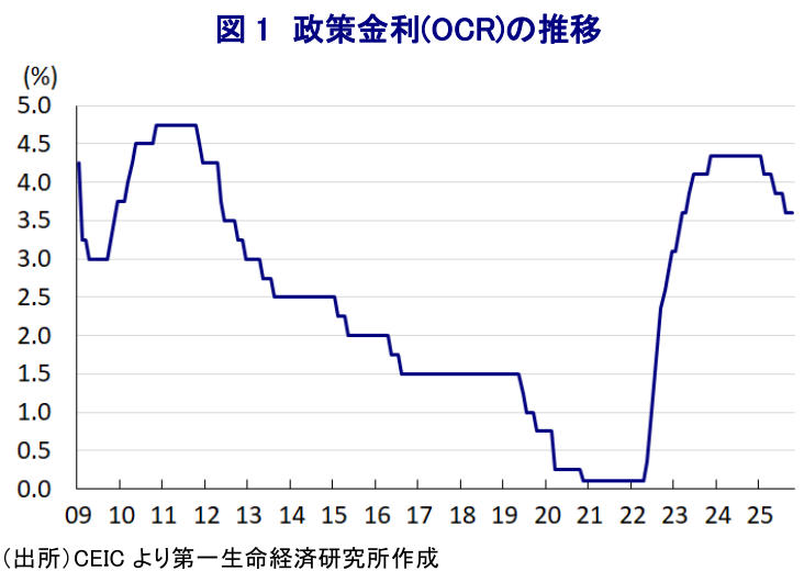 オーストラリアでは、準備銀行(RBA)が先月末の定例会合で政策金利(OCR)を2会合ぶりに据え置くことを決定した。RBAは、今年に入って2月、5月、そして8月の計3回、累計75bpの利下げを実施するなど金融緩和を進めてきた。この背景には、一昨年初めにかけて加速したインフレがその後に鈍化に転じるとともに、昨年後半以降はRBAが定める目標(2~3%)域内で推移するなど落ち着きを取り戻したことがある。さらに、インフレとRBAによる引き締め姿勢の長期化に加え、最大の輸出相手である中国経済の不透明感の高まり、トランプ米政権の政策運営を巡る不確実性も重なり、今年初めにかけてのオーストラリア景気は鈍化した。こうした事情も、RBAによる断続的な利下げの実施を後押ししたと捉えられる。