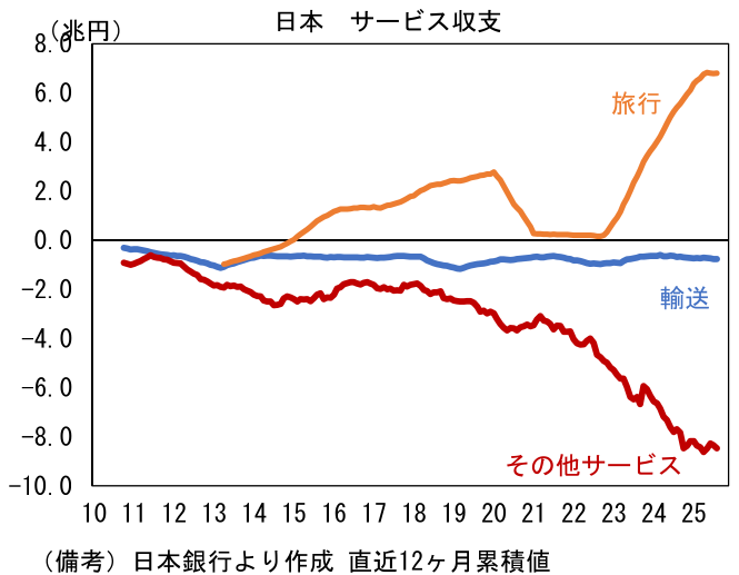 日銀の政策判断における為替の重要度は増していると考えられる。一方、ここへ来てUSD/JPYは日米金利差離れの性格を強めており、日銀の利上げが円高誘導に資するとは言えなくなっているのも事実である。日米金利差の説明力が低下する要因として大きいのは貿易・サービス収支の構造的な赤字体質であり、このことは外為市場において実需のドル買い・円売りが常に優勢になっていることを意味する。近年、市場関係者の間で注目されているのはデジタル赤字であり、これは構造的な色彩が強い。他方、それを打ち消しているのは空前のインバウンド需要による旅行収支の黒字であり、現在のところサービス収支の一方的な赤字拡大は回避できている。とはいえ、インバウンド需要に支えられた旅行収支の黒字は外生的な要因が多く働くことから、急減することもあり、円需給を支える存在としては心許ない。それを象徴する動きとして2025年7月5日に大地震があるとの風説により6・7月のインバウンド需要が落ち込んだことがあった。こうした円需給の悪さに鑑みると、日銀の利上げが為替に対して所期の効果を発揮するかは微妙であるが、逆に言えば、それだけ日銀が円安から逃れるのは難しくなっているのではないか。