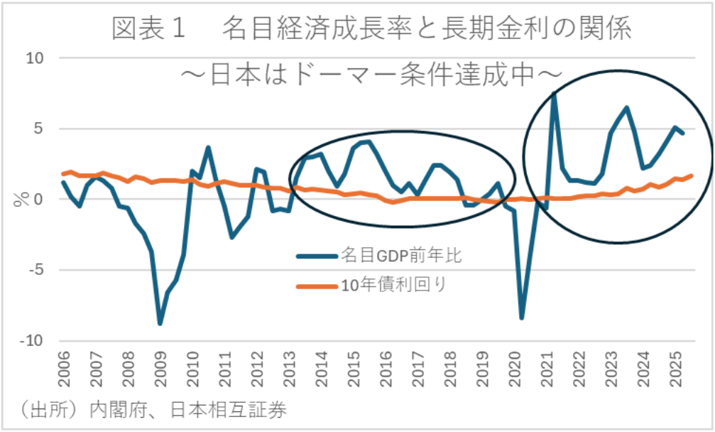 こうしたことからすれば、サナエノミクスにおける財政の予算制約は、これまでのプライマリーバランス(以下:PB)から政府債務もしくは純債務残高の対GDP比にシフトすることが望ましいといえよう。特にPB目標が導入された2000年代前半はデフレが定着しており、名目成長率が長期金利を上回ることが厳しい状況にあった。しかし、アベノミクスをきっかけにデフレではない状況になって以降は、名目成長率が長期金利を上回る状況が常態化しており、アベノミクス以前の経済環境とは状況が異なる(図表1)。