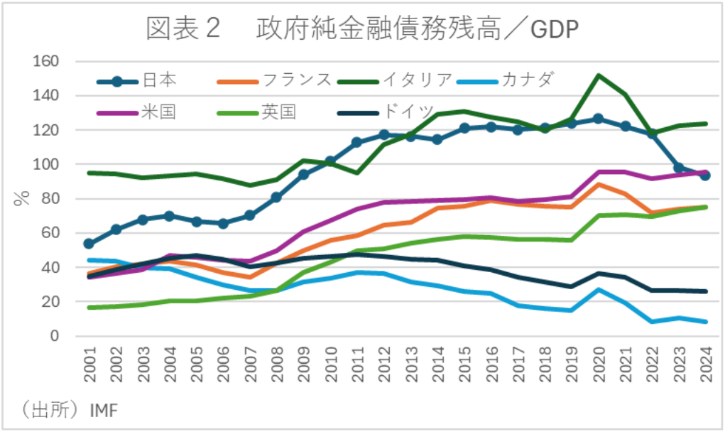 事実、すべての金融資産を含む『政府純金融債務残高/GDP』をG7で比較すると、IMFの2024年ベースで日本は急速に低下しており、水準もイタリアや米国より低い(図表2)。