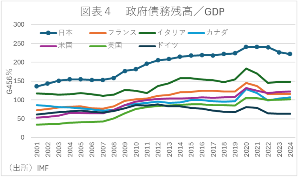 なお、資産に株式及び投資信託受益証券や金融派生商品を含まない「政府純債務残高/GDP比」や「政府債務残高/GDP比」は依然としてG7で最高水準だが、それぞれ適温水準は各国の経済環境により異なり、重要なのは低下方向にあることである。その点、いずれも日本はその方向にある(図表3・4)。
