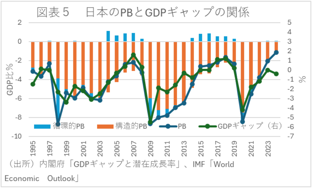 実は、PBとGDPギャップの連動性は高く、経済が高圧気味に推移すれば自ずとPB自体も健全化するといった関係がある。実際、1990年代後半以降のPBと内閣府版GDPギャップの関係を見ると、非常に連動性が高いことがわかる(図表5)。そして、近年はGDPギャップの動向以上にPBが改善しているが、考え方次第ではGDPギャップ対比で財政を引き締めすぎた可能性も示唆される。