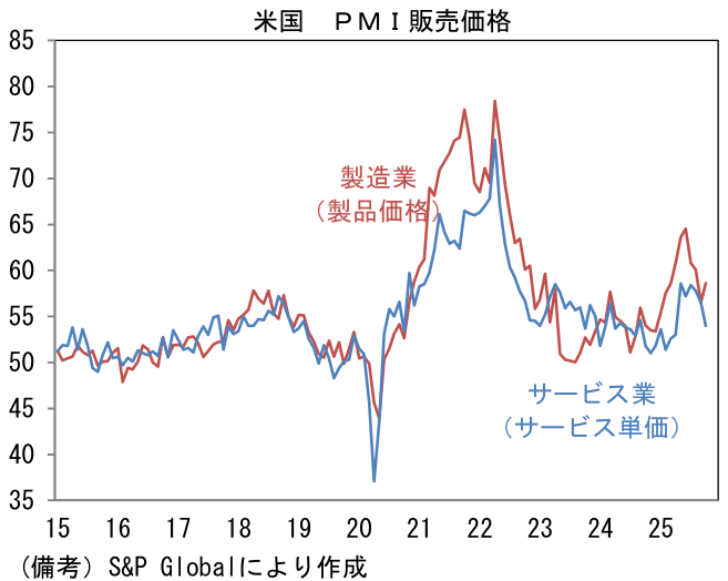類似指標の10月サービス業PMI確定値は54.8へと0.4pt下方修正されたものの、好調と評価して良い領域にある。新規受注(53.6)、雇用(51.4)がそれぞれ50をはっきりと上回っている他、受注残(50.6)も積み上がった状態にあり、減速の気配に乏しい。政府機関閉鎖による間接的な下押し圧力もあったと推察されるが、AI関連投資の波及効果に加え、堅調な個人消費がサービス業の業況を支えたとみられる。