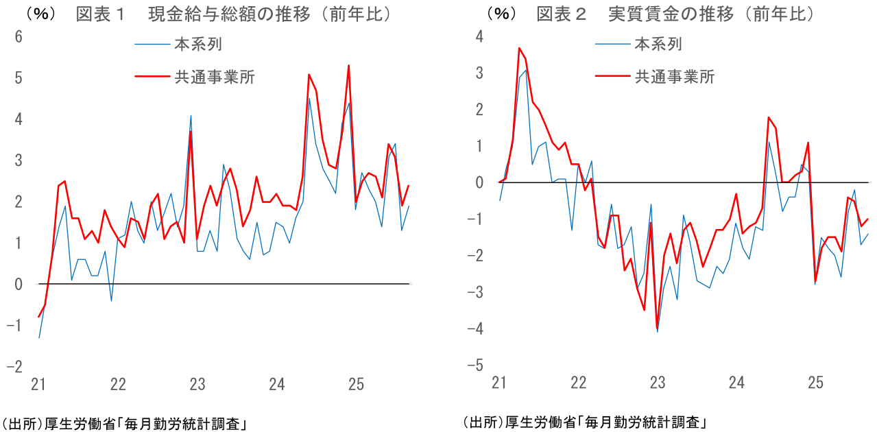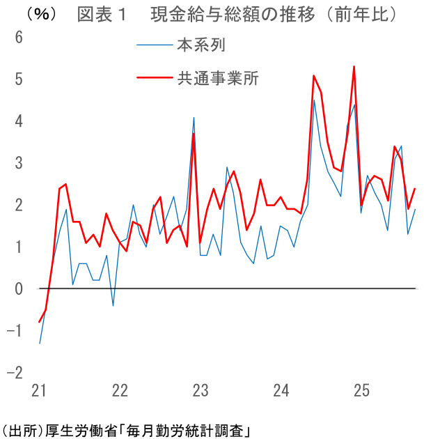 所定内給与(共通事業所ベース)は前年比+2.2%と、前月(同+2.4%)からやや鈍化。25年春闘の影響はほぼ出尽くしており、この先の所定内給与は前年比+2%台前半~半ば程度で推移する可能性が高い。最低賃金大幅引き上げへの過度な期待は禁物。