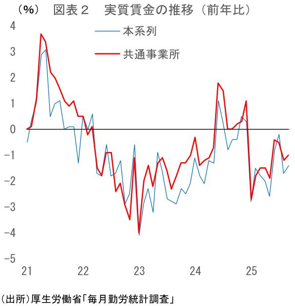 25年9月の毎月勤労統計では実質賃金が9ヵ月連続で減少。賃金の伸びが物価上昇に追い付かない状況が継続。