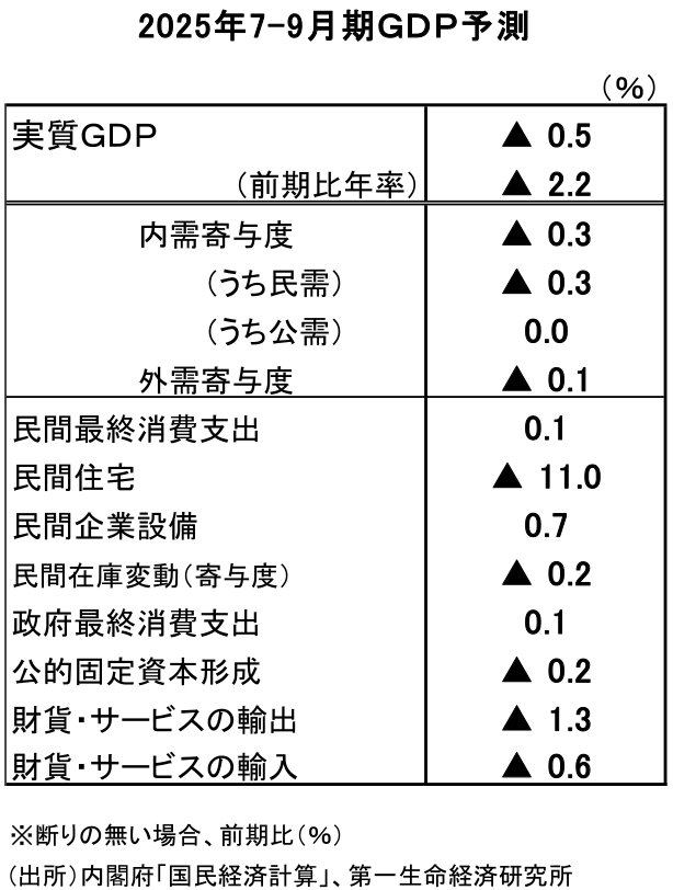 (需要項目ごとの解説は、「2025年7-9月期GDP予測(1次速報) ~住宅投資と外需が足を引っ張り、前期比年率▲2.7%とマイナス成長を予想~ | 新家 義貴 | 第一生命経済研究所」(10月31日発行)をご参照ください)