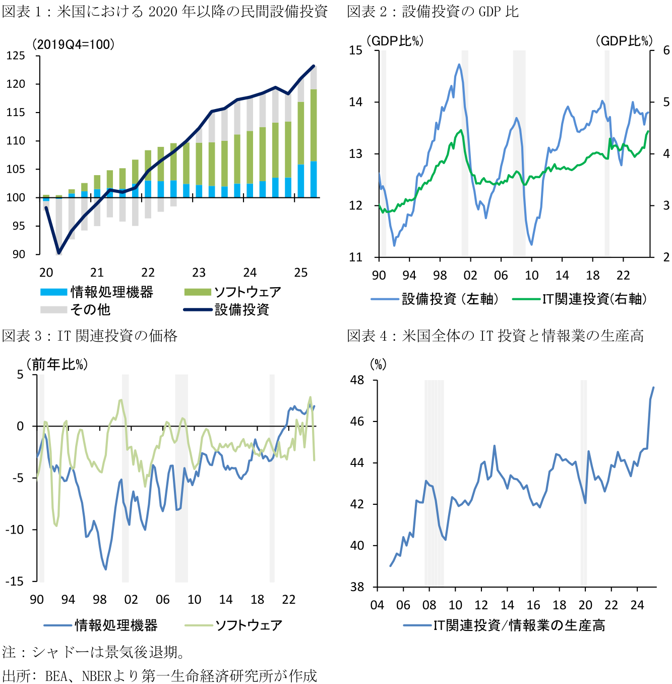 - 米国のAI関連投資が活発だ。IT関連投資(情報処理機器とソフトウェアの合計)のGDP比は2025年4~6月期で4.4%と、2000年代前半におけるITバブルのピーク時(2020年10~12月期:4.5%)に匹敵する。当時と異なり、足下ではハードウェアの技術革新による影響は限定的にみえる。