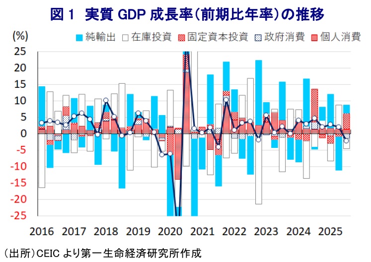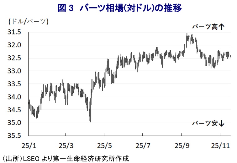 経済面では、関税発動前の駆け込み輸出で一時押し上げられたが、本格発動で勢いに陰りが出ている。中国人観光客の低迷は観光業の足かせとなっている。7-9月の実質GDP成長率は前期比年率▲2.24%と久々のマイナスとなった。個人消費や設備投資など民間需要は底堅い一方、政治混乱が政府消費の重しとなった。しかし、在庫調整が成長を押し下げるなど実態は数字ほど悪くないとみられる。アヌティン政権は景気下支え策を強化しているが、外需を巡る不透明感は高く、先行きの景気に対するリスクは残る。