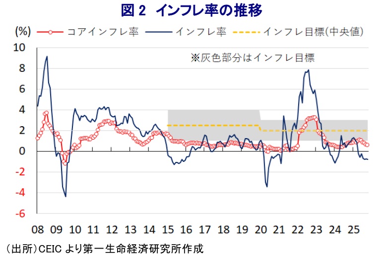 生産面では、製造業や鉱業が堅調な一方、観光業や農林漁業の不振が足かせとなった。インフレ率はマイナスで推移するなどディスインフレ基調だが、今後は生活必需品で物価上昇が進む可能性はある。しかし、雇用環境が不透明ななかでの生活必需品の物価上昇は家計部門を巡る状況を悪化させる懸念がある。