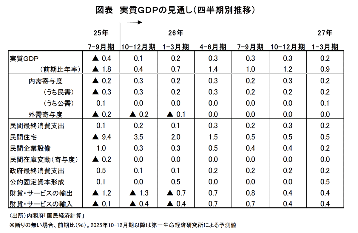 25年7-9月期の実質GDP成長率は前期比年率▲1.8%のマイナス成長となった。法改正に伴う駆け込み需要からの反動減によって住宅投資が急減したことが押し下げたほか、輸出が減少したことも影響した。もっとも、住宅投資の落ち込みは一時的なものにとどまる可能性が高いことに加え、輸出も4-6月期の増加からの反動が生じた面もあるため、7-9月期の成長率の弱さについて過度に悲観視する必要はない。これまでのプラス成長と均してみれば景気は上向きと判断できる。米国経済が関税引き上げのもとでも底堅さを保っていることで、当初懸念されていたような日本からの輸出が失速する事態は避けられており、景気腰折れに直結する動きは現時点で確認されない。