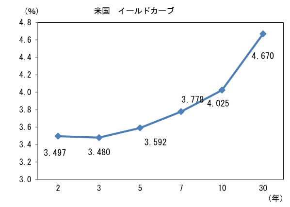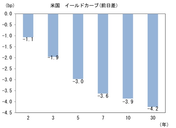 米金利はカーブ全般で金利低下。予想インフレ率(10年BEI)は2.227%(▲2.4bp)へと低下。