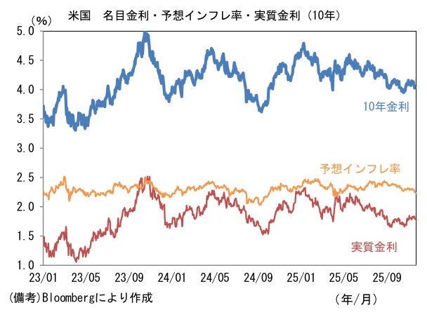 Fedの利下げ観測を巡っては、現在のFF金利先物が示唆する下方ターミナルレートが3%付近にあり、追加で4回の利下げが織り込まれた状態にある。もっとも、12月FOMCではデータが不足する中、金融市場も安定していることから、利下げがスキップとなる可能性がある。また今後、政府機関閉鎖の解除に伴って発表される最新データが米経済の底堅さを示すものであれば、2026年の予想利下げ経路は上方修正される可能性があろう。ただし悩ましいのは、K字型経済をFedがどう取り扱うかである。現在の米経済は、雇用の量的拡大が風前の灯火となり、消費者心理も悪化しているにもかかわらず、個人消費が堅調に推移するなど全体の成長軌道は崩れていない。8月時点で実質個人消費支出は3ヶ月前比年率で+2.4%と堅調な伸びを示していた。その背景には株高を後ろ盾とするごく一部の富裕層の高額消費があるとされており、マクロ的な弱さを覆い隠しているとの指摘も多い。また消費以外でも、データセンターなどAI関連投資の急増という局所的事象により、全体の弱さが見えにくくなっているとの指摘もある。Fedが富裕層消費、AI需要を取り除いて政策判断をするなら、市場予想どおり3%近辺まで利下げが進むことになりそうだが、筆者は景気が底堅さを維持する中、インフレに対する警戒もあり、3.5%付近で利下げを終了するとみている。そうであれば、ドルは円を含む主要通貨に対して上昇するだろう。