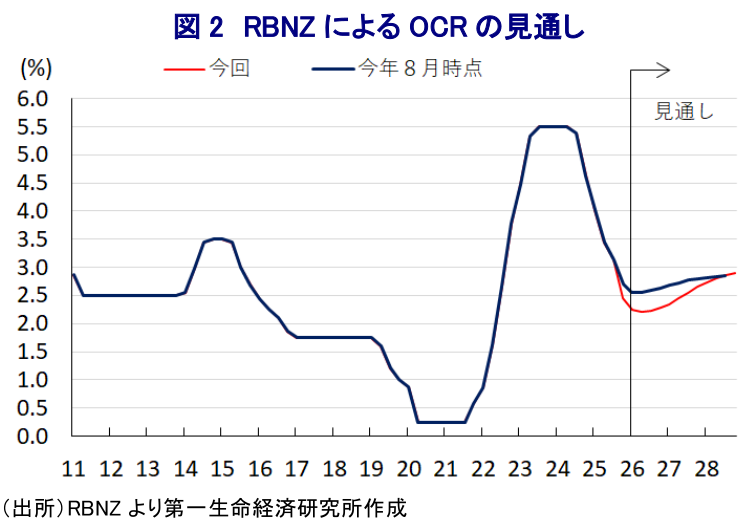 また、米国はニュージーランドに対する相互関税を一律分と同じ10%としているものの、ニュージーランド経済にとって対米輸出額は名目GDP比2%、輸出全体に占める対米比率も13%弱であり、トランプ関税による直接的な影響は相応に生じる可能性がある。そして、輸出全体に占める対中比率は4分の1を上回るため、中国景気の動向に加え、米中関係の行方も外需の動向を左右することが懸念される。こうしたなか、今月初めに公表された7-9月の失業率(季調済)は5.3%と約9年ぶりの水準に悪化した。若年層を中心に雇用調整が続いており、賃金上昇の伸びも鈍化するなど家計部門を取り巻く環境は悪化するなど内需を巡る状況も厳しさを増している(注2)。前述したように、RBNZは先月の前回会合において追加利下げに言及していたため、事前の市場予想では今回も追加利下げに動くとの見方が広がった。その一方、今回はホークスビー現総裁の下で開催される最後の会合であり、来月1日付で現在はスウェーデン国立銀行(リクスバンク)第1副総裁を務めるブレマン氏が次期総裁に就任するため、どういった方向性を示すかも注目された。会合後に公表した声明文では、物価動向について「足元で加速しているが、余剰生産能力を理由に来年半ばには目標の中央値(2%)近傍に鈍化する」として、前回会合時点から2%への収束期間が幾分後ろ倒しされる可能性に言及した。その一方、景気動向について「今年半ばにかけて弱含んだが、回復傾向にある」とした上で、「金利低下が家計支出を促し、雇用環境も安定している上、NZドル安は輸出を下支えしている」との見方を示している。そして、物価見通しについて「リスクは均衡している」とした上で、不動産の動向について「改革や規制の効果発現により上昇ペースは緩やかになり、インフレへの寄与も緩和が見込まれる」との見通しを示している。その上で、今回の協議について「金利据え置きと25bpの利下げの選択肢が討議された」とした上で「5(25bpの利下げ)対1(据え置き)で決定した」ことを明らかにしている。なお、同時に公表されたOCRの見通しに基づけば、足元の利下げ局面の終了が近付いている可能性を示唆していると捉えられる。