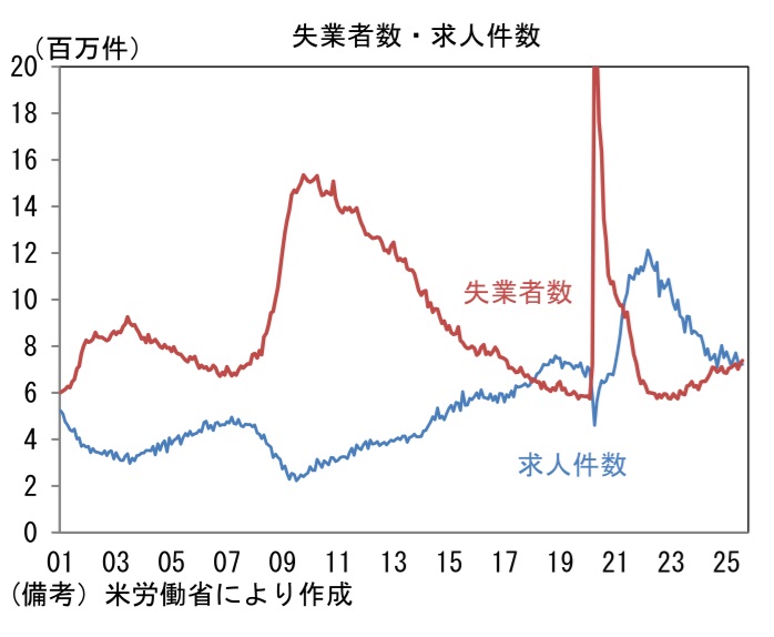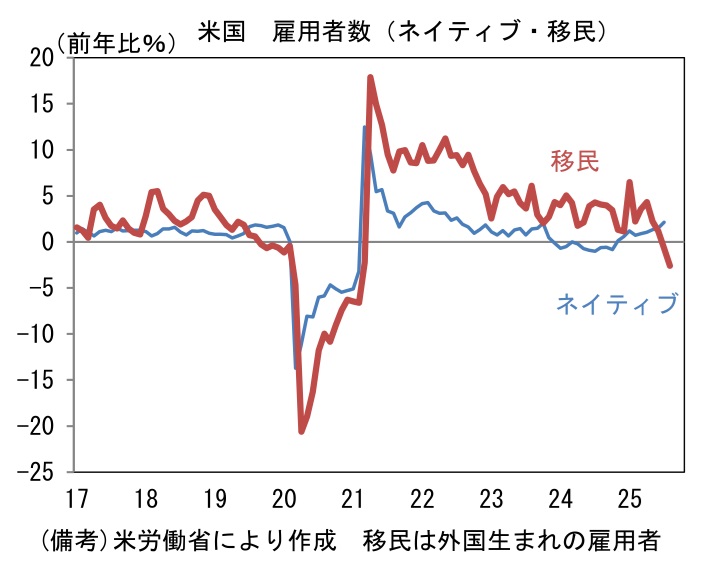 - そうした中、雇用の量的拡大は風前の灯火になっている。雇用者数を移民とネイティブに分けてみると、移民に弱さが集中していることから、移民政策の厳格化が影響していることに疑いの余地はないが、この間、求人件数の減少が同時に観察されていることに鑑みると「量」の弱さは労働需要にも問題があるとみられ、経済全体として需要の乏しさが疑われる。現在の米労働市場は「雇わない・解雇しない(No Hire No Fire)」と言われるように流動性が低下し、縮小均衡の様相を呈していることから失業率の上昇は限定的であるが、今後も労働需要が不足気味となれば、労働市場は「手遅れ」の状態まで悪化してしまう可能性はある。