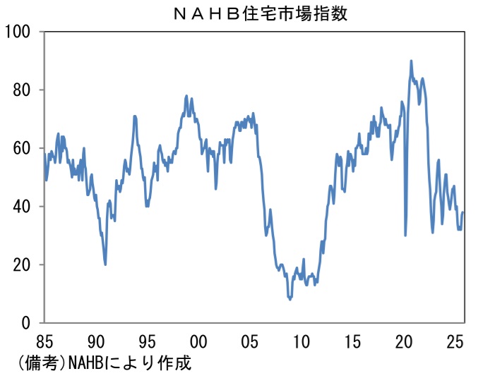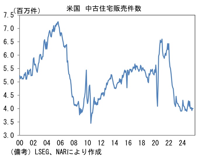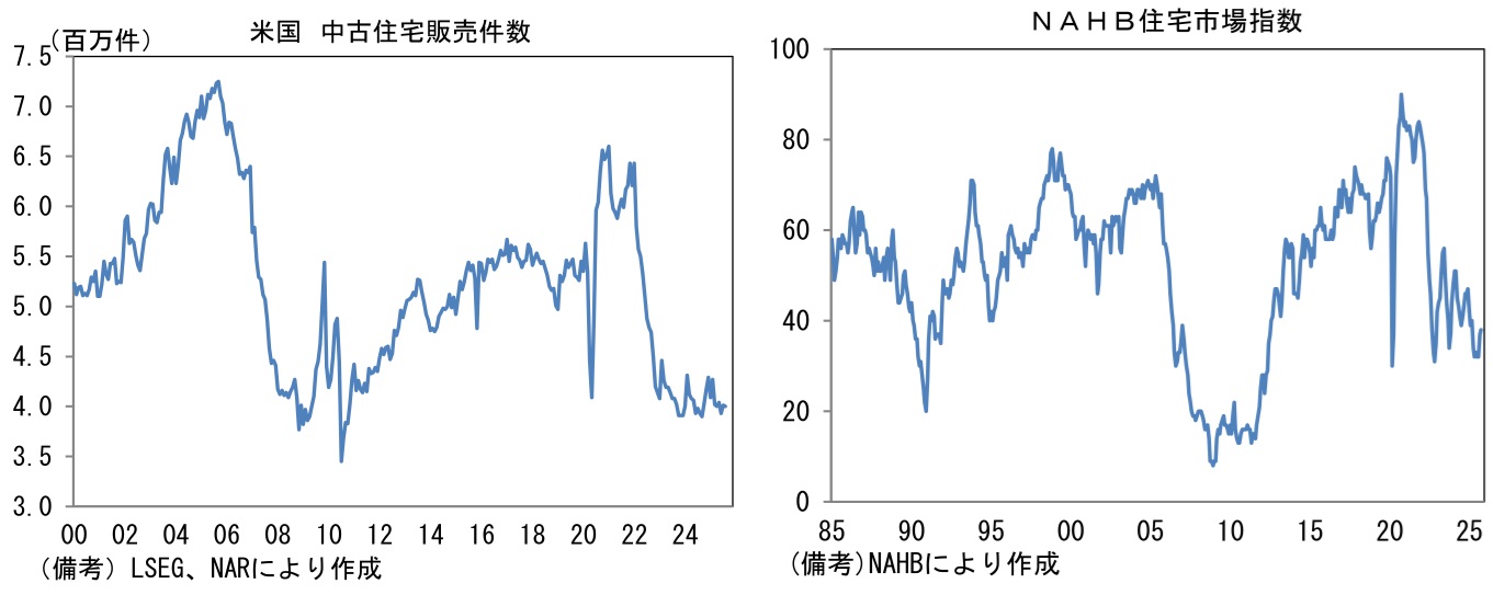 - もちろん、それを手当するのはFedの利下げである。米国経済の本質的な強さは「いざとなったら4%の利下げ」という選択肢を有していることであろう。政策金利水準の高さは、政策対応余地が大きいことの裏返しであり、ここが日本経済と決定的に異なる。利下げの直接的効果は住宅市場に強く発現する。幸か不幸か、トランプ大統領も気をもんでいる住宅市場は、物件価格が高止まりするなか、住宅ローン金利が高水準にあることから、中古住宅販売件数は年換算400万件程度に落ち込んでいる。また住宅建設業社の景況感を示すNAHB住宅市場指数はコロナショックの最悪期と同程度で推移しており、良くも悪くも改善余地が豊富にある。今後、Fedが緩和姿勢を明確にすれば、金利敏感セクターの住宅市場が息を吹き返すことで米国経済は一定程度下支えされる公算が大きい。もちろん、自動車ローンやクレジットカード(リボリング払い)の金利低下などを通じて個人消費を刺激する効果もある。