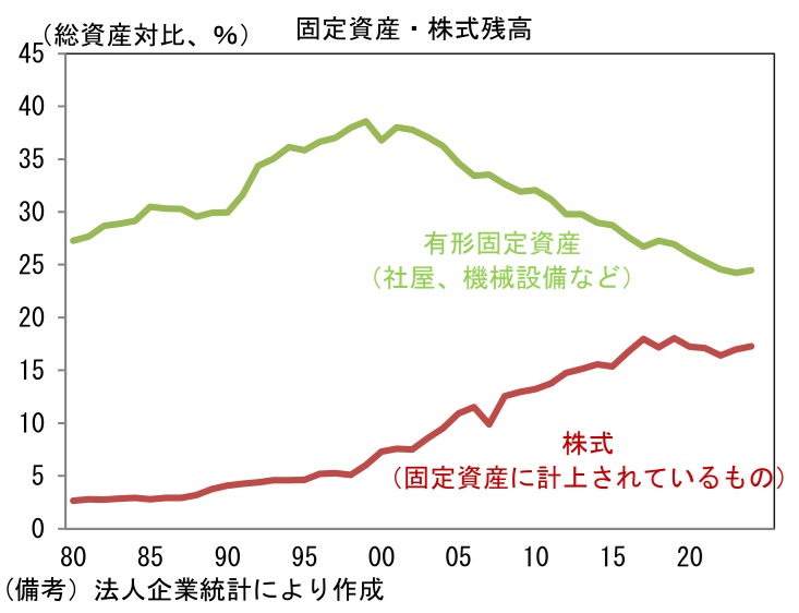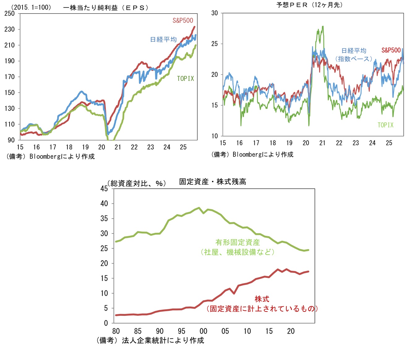 - ここで日経平均株価が6万円などに達するアップサイドリスクについて考えてみたい。日経平均株価が6万円に達するためには、現時点における来期予想EPS(2239)を前提にすると、PERが27倍程度まで上昇する必要がある。日経平均株価が52,000円を超えていた10月末のPERが24倍であったので、当時を上回る高揚感が到来することになる。もし、そうした環境が訪れるとしたら、それは日本企業の積極的な設備投資・研究開発によって、成長期待が高まるケースであろう。PERは成長期待の代理変数であるから、株主還元の強化などでは高まりにくく、成長の種蒔きが必要となる。また海外M&Aも成長期待を高めるとは言い難い。法人企業統計でも示されている通り、日本企業は余剰資金の振り分け先として、海外M&Aを重視し、国内設備投資を後回しにする傾向にあり、法人企業統計では有価証券投資が積み上がる一方、有形固定資産は減少傾向が観察されてきた。企業としては成長の活路を海外M&Aに求めての決断なのであろうが、失敗例も多いことから、投資家の目線で見ると期待と不安が両建てで高まり、結果的にPER上昇には繋がりにくいというのが一つの答えであると筆者は理解している。