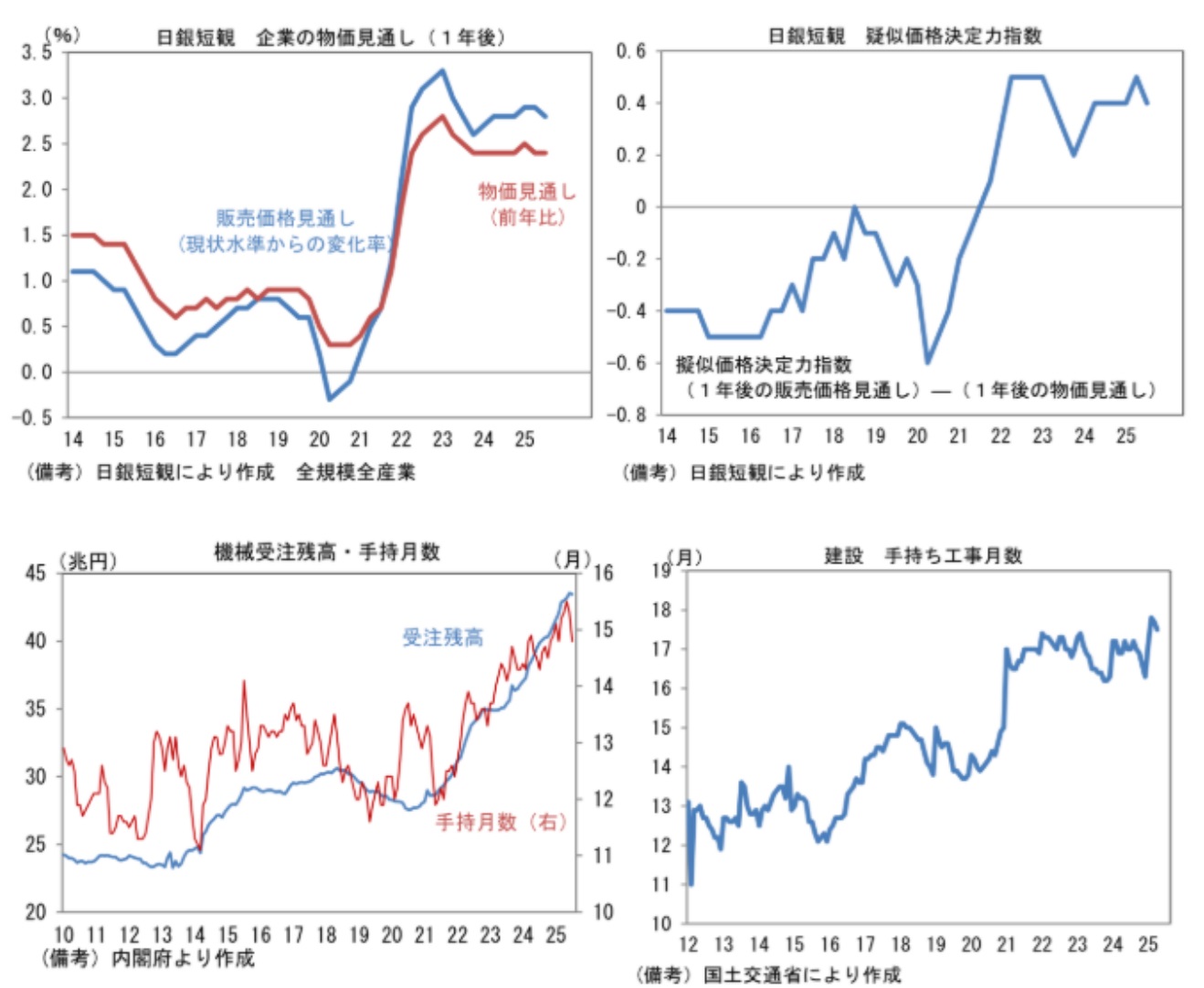 - 国内設備投資については、インフレによって企業行動が変革し、加速する可能性があろう。待てば安くなるデフレ経済がしばしば「我慢比べ」や「消耗戦」と言われたのに対して、待つと高くなってしまうインフレ経済は「早い者勝ち」の側面があり、企業の意思決定が迅速化する可能性があろう。また家計と同様に企業も現預金に経営資源を寝かせておくと、インフレによる目減りに直面してしまう。それを回避するために企業は設備投資、研究開発、人的資本形成といった、前向きな使途に経営資源を振り分ける可能性があるだろう。インフレによってあらゆる名目資産の価格が上昇する局面では、①自社製品(≒新製品、新設備から生産される財)の期待キャッシュフローが高まりやすい。同時に②資本財価格(設備投資費用)の値上がりも予想されるため、企業には設備投資の意思決定を急ぐ誘因が生じる。また、その間に自社の株価が上昇した状態にあれば、経営者は、新たな設備投資が投資家の更なる評価向上に繋がると期待し、設備投資拡大に踏み切る(これはトービンのqで説明される企業行動)。このようにインフレ下では設備投資のハードルが低下する。現実のデータとして、①は企業の予想物価上昇率の高まりがあり、日銀短観(全規模・全産業、1年後)で企業の価格設定行動が積極化していることが対応する。現在、企業は日本の物価上昇率よりも自社製品・サービスの価格上昇率を高く見積っている。②は、機械受注統計や建設関連統計における受注残高の増加が資本財価格の値上がりを示唆しているだろう。受注残高の増加は、旺盛な需要に対して供給が追い付いていないことを浮き彫りにしており、企業が投資計画を先送りすることのコスト増大を映じていると考えられる。もちろん、最低賃金引き上げ方針など労務費の増加もある。